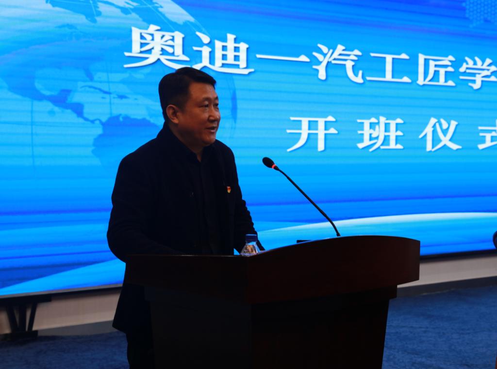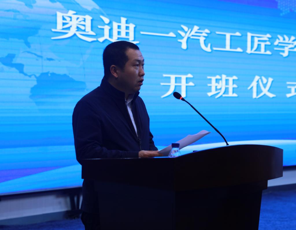 奥迪一汽新能源汽车有限公司人事部经理陈嘉作为企方代表出席仪式并致辞,对本次与学校联合共建的工匠学徒制班表示了认可与肯定,期待未来在与学校开展更多维度、更深层次的合作。