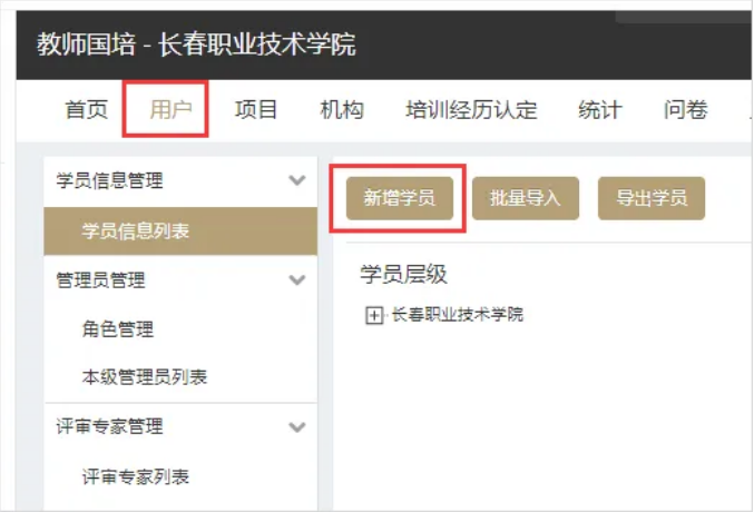第三步:在“用户”页面中的“学员信息列表”中选择“新增学员”,在系统中添加“参训学员”信息。如系统中已有该学员信息,此步忽略。