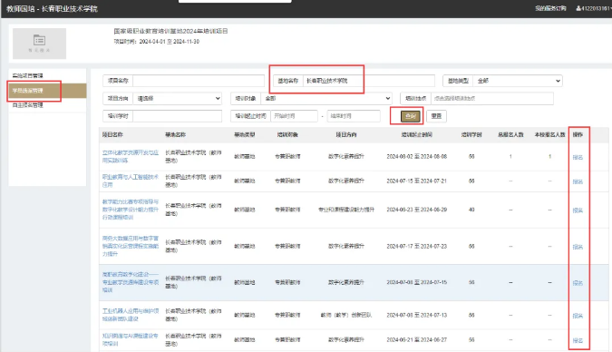 第五步:点击左侧“学员选派管理”,在基地名称中输入“长春职业技术学院”,点击“查询”,点击对应培训项目右侧“报名”,进入报名页面。