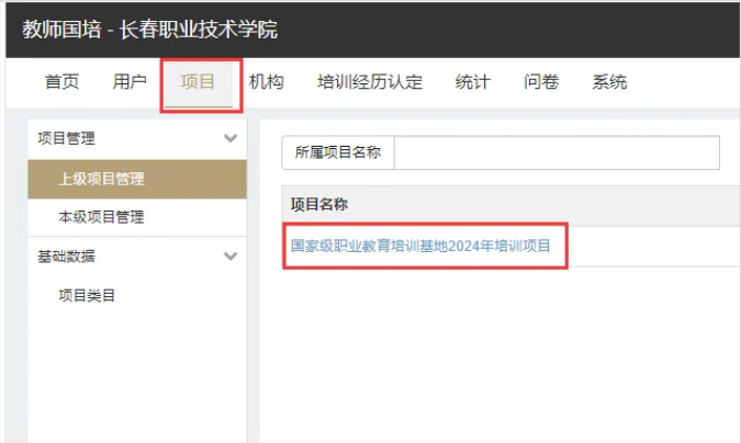 第四步:进入“项目”页面,点击“国家级职业教育培训基地2024项目”。