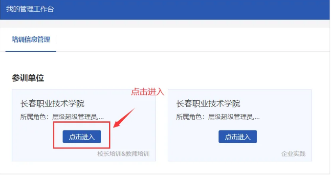 第二步:进入“我管理的工作台”,从“参训单位”端口进入。