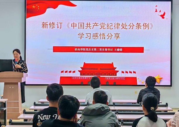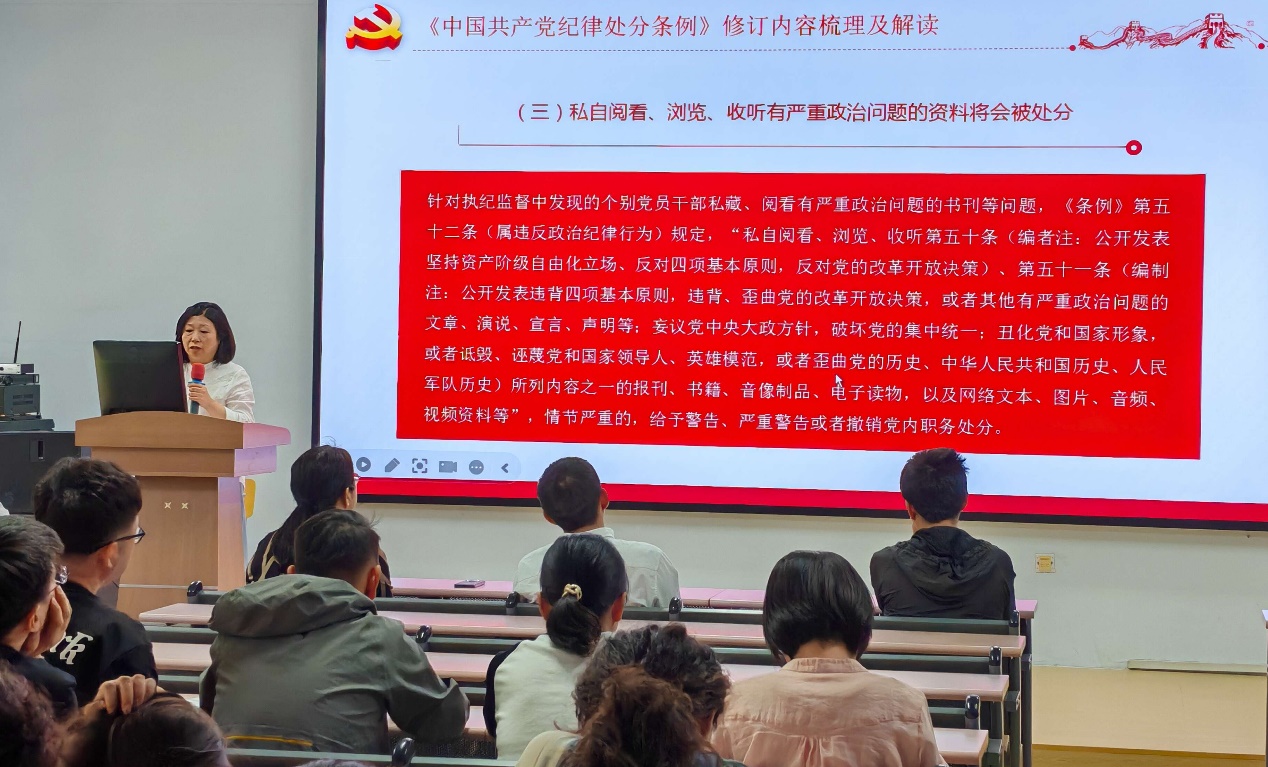 党支部书记与党总支书记分别从“严守纪律底线、砥砺担当作为”心得体会、六大纪律“负面清单”、《条例》学习感悟、《条例》突出特点、《条例》修订内容梳理解读等多个维度,分享了学习收获。通过讲座学习,与会同志深受启迪,进一步感受到新修订《条例》的严肃性、权威性和重要性,提高了思想认识,增强了纪律意识和规矩意识。